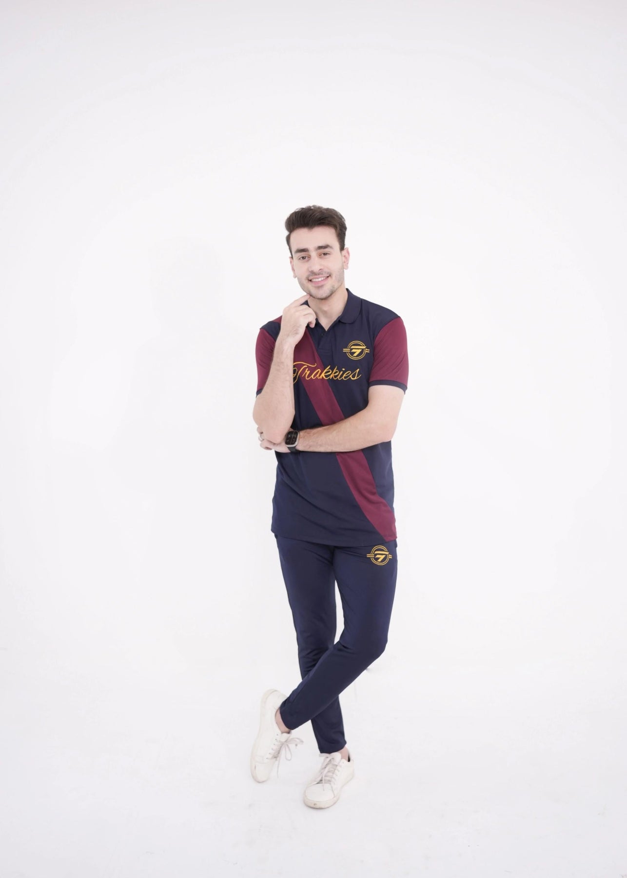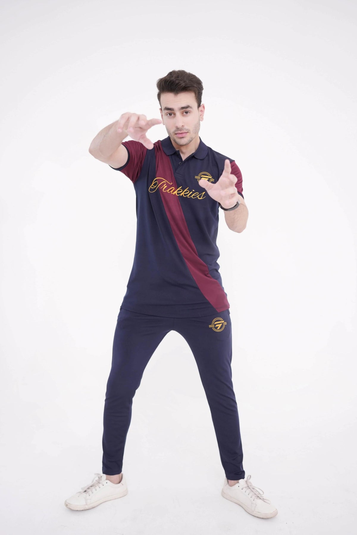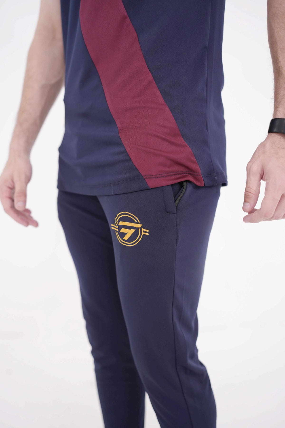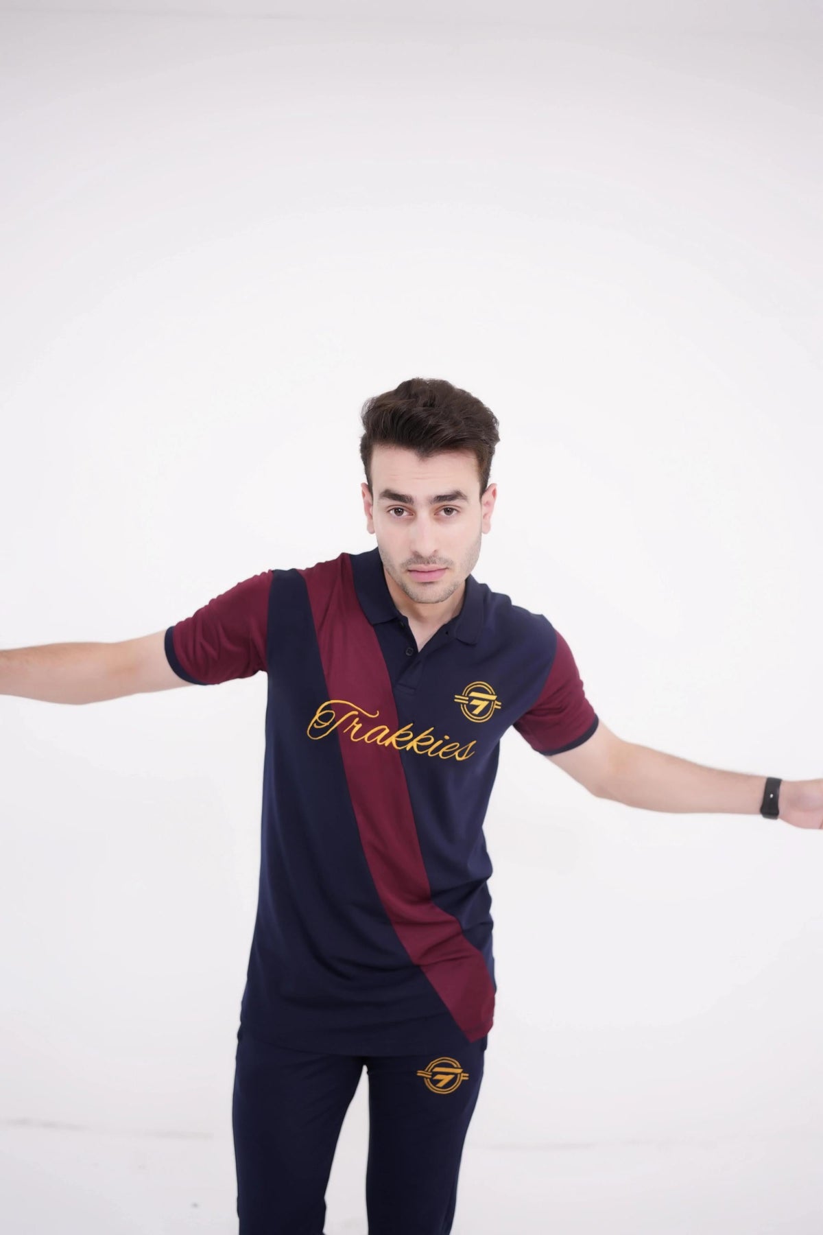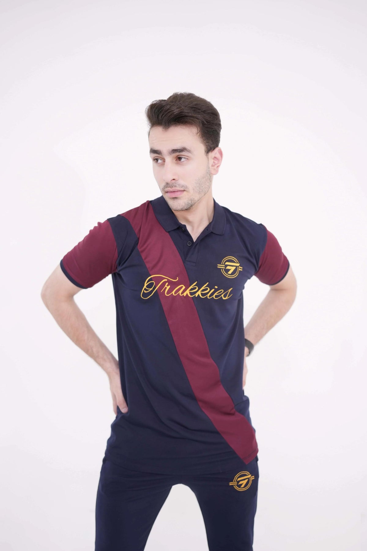 • Gold/navy polo shirt and matching trousers with contrast pocket details