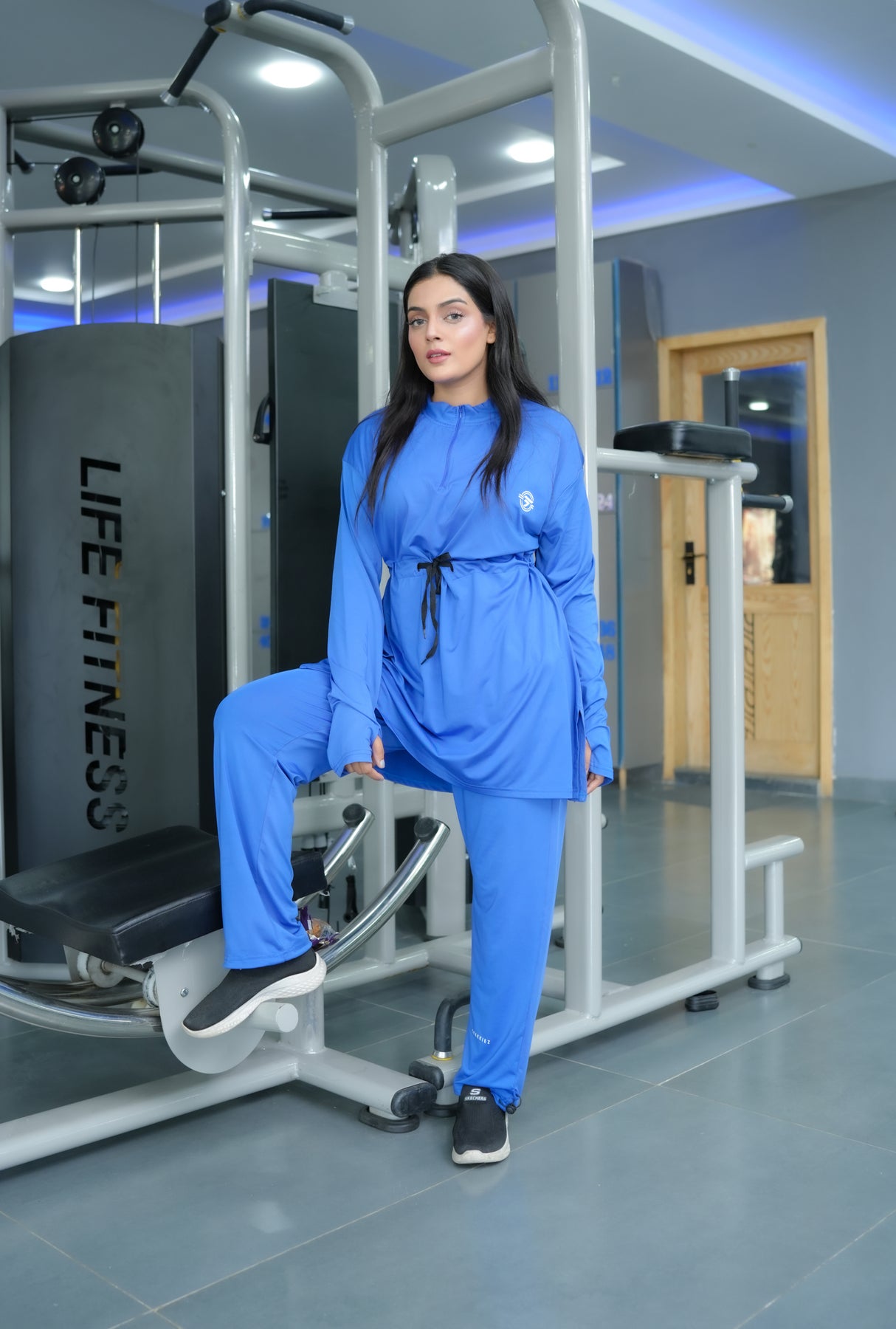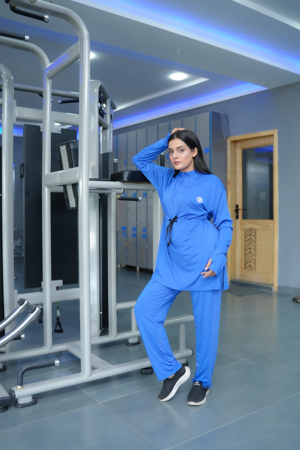 Modest navy blue belt top with navy blue trouser (athleisure set) with embroidered logo